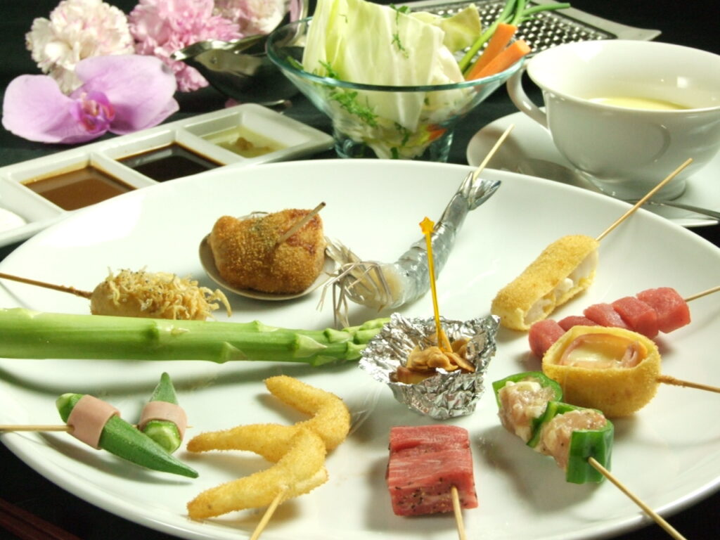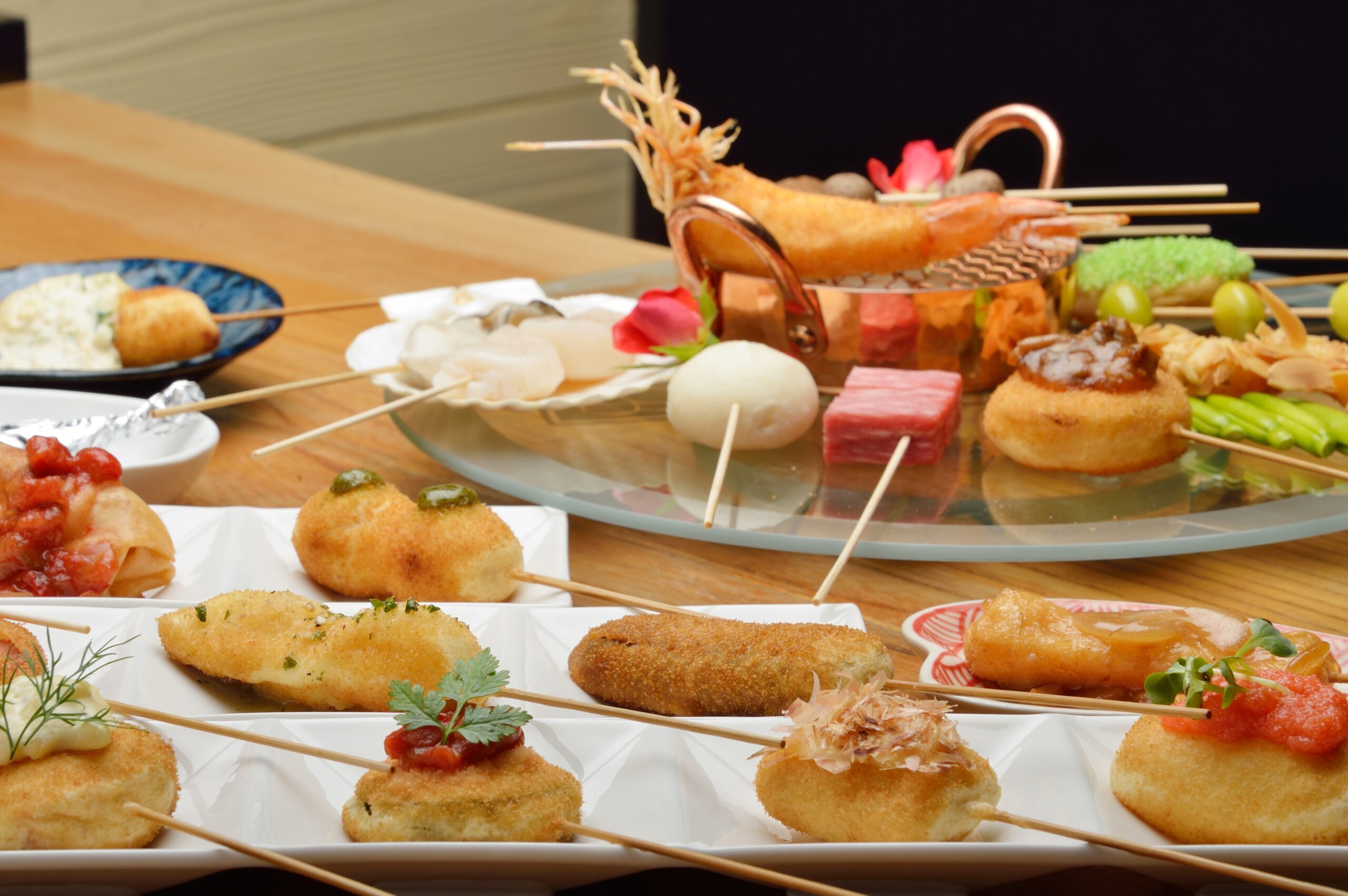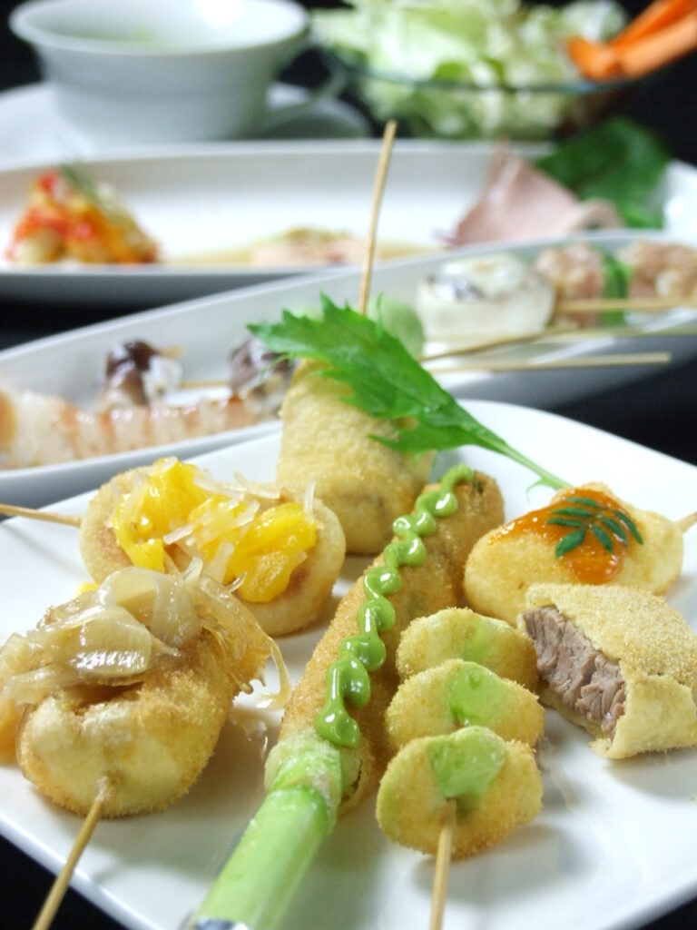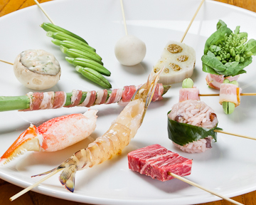 「北新地 串柾」は、一流店や老舗が軒を連ねる大阪北新地でも、本格的な創作串揚げをリーズナブルに味わえる人気店。理想のパン粉をつくるためだけに特注のパンを削ってつくるというパン粉は、きめ細やかで口当たりも優しく、油も吸わないのでアッサリ食べられるのが特徴です。バラエティに富んだ食材のラインナップも「串柾」 の魅力。串を通された食材の数々は、ミディアムレアに仕上げて余熱で芯まで熱を通し、素材本来の美味しさを余すことなく提供しています。